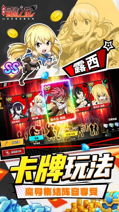 《点击冒险之旅》是一款改编自经典动漫《妖精的尾巴》的卡牌游戏,由明星团队耗时数年精心打造,带你重温魔导世界的热血与感动!百位个性鲜明的魔导士化身为魔力卡牌,静待与你邂逅。创新的卡牌对战机制打破传统回合制的单调,独特“助战”玩法更添羁绊与策略深度!此外,公会对抗、大魔斗演武、强者试炼等丰富副本玩法,让你在战斗中不断成长,更有超多趣味挑战等你解锁!