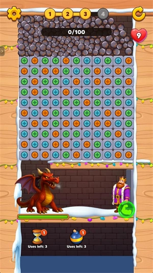 游戏里的玩法挺有意思,玩家得消除这些方块,让石头或其他物品从高处落下时不会伤到国王。要凑够三个相同的方块才能完成挑战,得在有限时间里快速消除来保护国王安全,还得不断消除各类方块触发机关,达成不同目标,体验不一样的闯关乐趣。