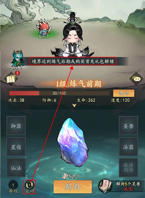 玩家通过提升修为境界,还能解锁灵石自动解封功能,解放双手,实现挂机修炼。