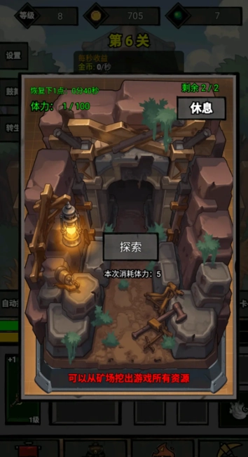 5、玩家还可参与挖矿玩法,通过挖矿获取金币、装备等提升战力的资源。不过挖矿存在体力限制,玩家每天可通过观看广告3次来补充体力。