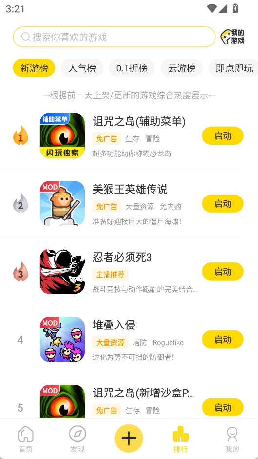 排行界面有新游、人气等多类榜单,快速发现优质游戏