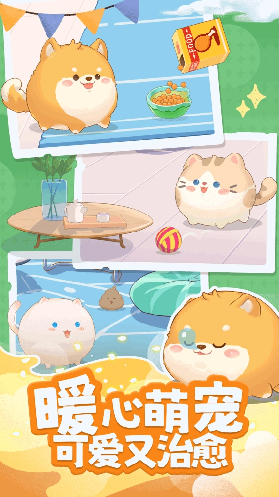 猫、狗、兔子、团团、布偶5种可爱萌宠任你挑选,每种萌宠都有自己独一无二的性格,以及专属动画。