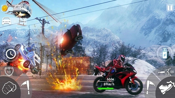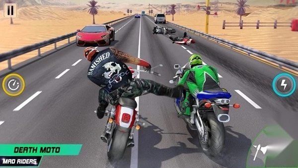 1、在公路竞速中融入攻击机制,通过踢踹、撞车等方式击溃对手,感受充满血腥与刺激的速度对决。