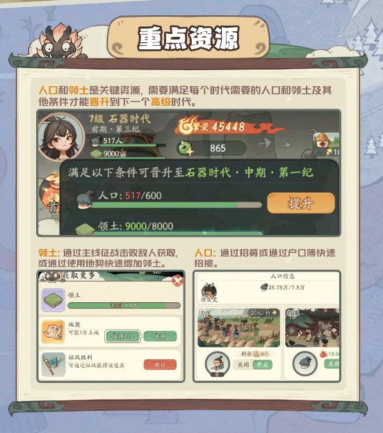 人口和领土是关键资源,满足每个时代重要的人口和领土及其他条件才能晋升到下一个高级时代。