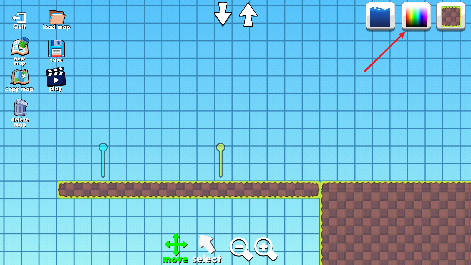 2、进入后点击右上角的功能键就可以制作地图,从左到右分别是液体种类、背景颜色和各种砖块。