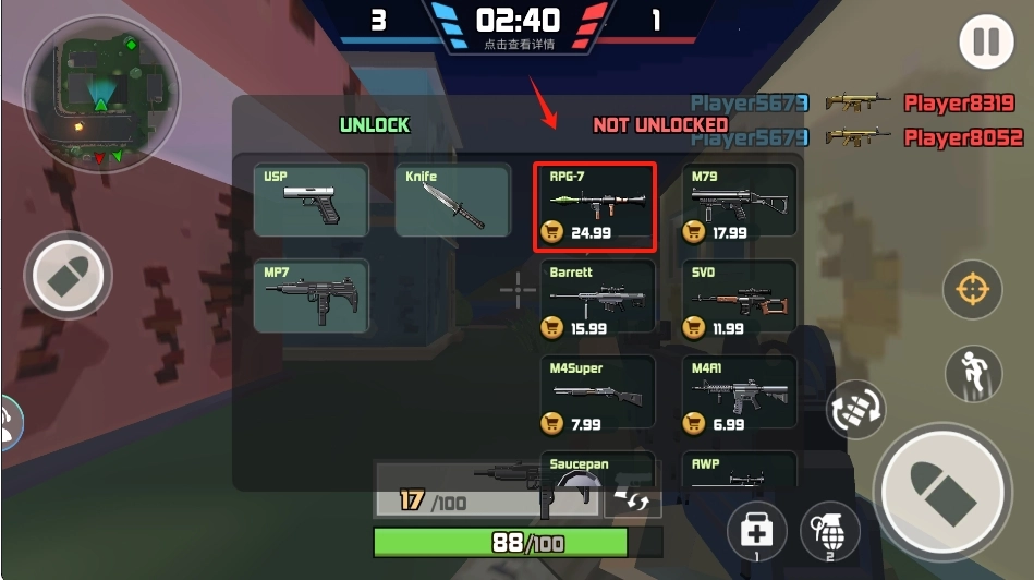 3、通过积累游戏内的货币,来解锁新的武器。在商店里,依据武器的价格挑选合适的装备,比如RPG-7,进行合理搭配,以此提升自身的战斗力。