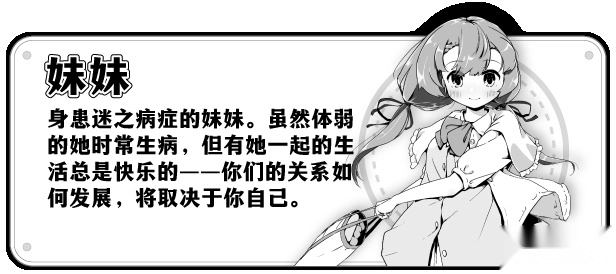 身患迷之病症的妹妹。虽然体弱的她时常生病,但有她一起的生活总是快乐的一一你们的关系如何发展,将取决于你自己。