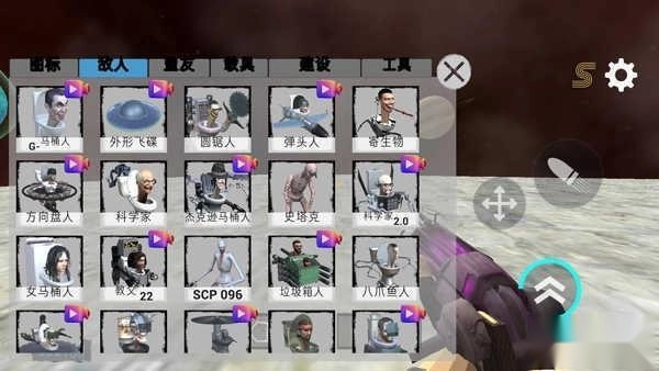 3、点击左侧的箱子按钮后,玩家能够挑选想要添加的敌人类型,像马桶人、圆锯人、弹头人、寄生物、外星飞碟这类都可以选择。