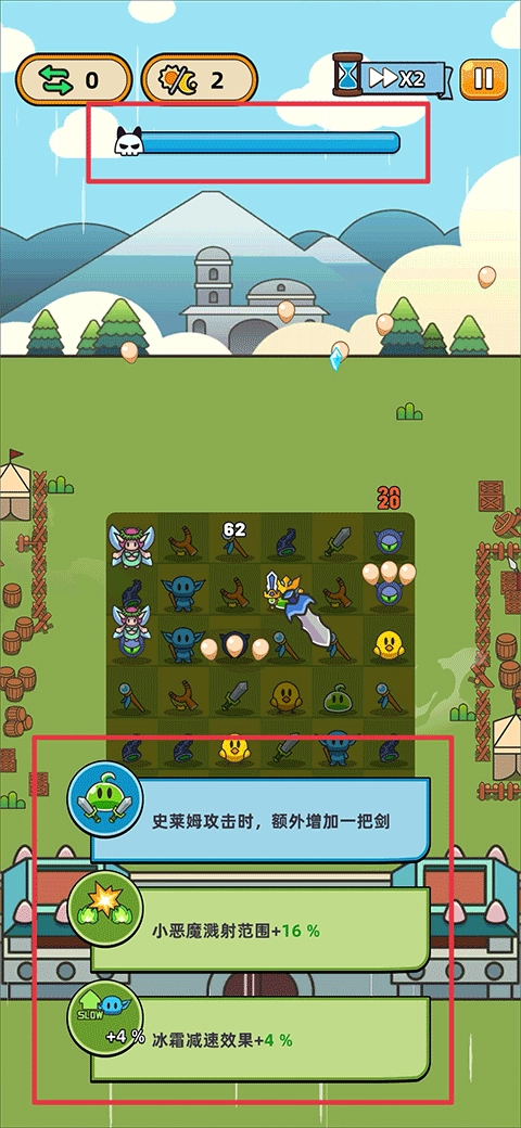 5、我方英雄成功抵挡来袭的敌人后可获得分数,当上方进度条填满时,也能解锁技能选择功能。