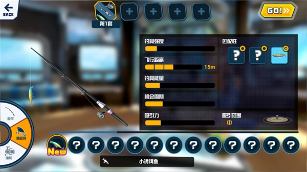 3、选好钓鱼点后就需要选择钓鱼装备,每一件装备能钓到的鱼都是不同的,选好装备后点击右上角的GO开始钓鱼。