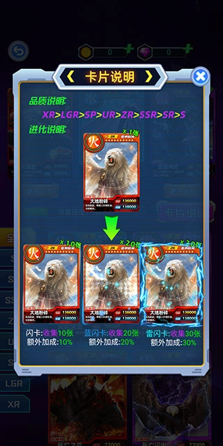 6、卡片品质由高到低排序为XR>LGR>SP>UR>ZR>SSR>SR>S,并且所有品质的卡片均支持进化。