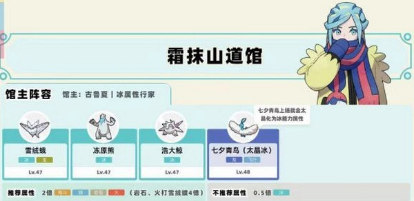 霜抹山冰系馆主古鲁夏!这是最后一个道馆了,你大可以暂时不打,先去到处溜达升级,到处都是火系宝可梦,随手抓只卡蒂狗用火焰石进化即可完美克制他!