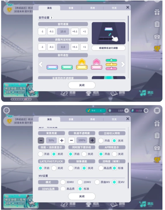建议把背景亮度调到最低(50%),关掉立绘切入特效、技能/活跃度,MV模式改为无MV(不然超影响打歌)。“音量”部分建议把“演出音量”下的“语音”关掉。