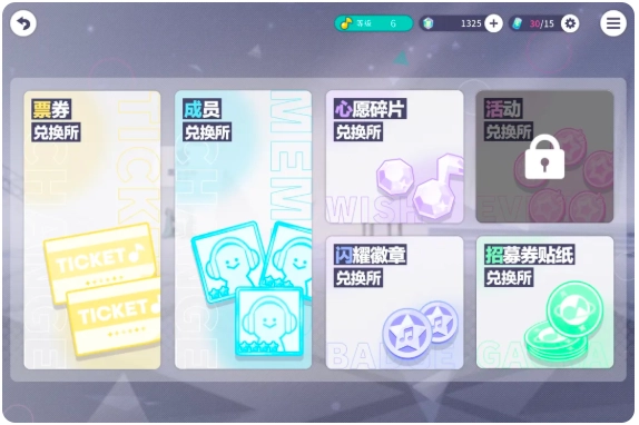 建议兑换优先级:水晶>演出能量饮料>练习谱>1w金币。心愿碎片、对应团的主唱卡、表情兑换券、音乐卡可看个人需求兑换。