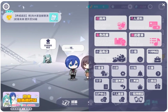 虚拟演唱会:在这个模式中可以让各位玩家实时在游戏中体验演唱会,在观看演唱会的时候,玩家的形象被称为豆腐人在虚拟演唱会过程中,可以通过点击屏幕来挥动应援棒,滑动或倾斜设备来自由移动视角。看完演唱会可以拿到水晶和表情包等奖励。