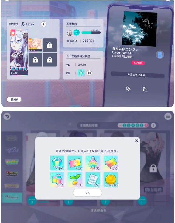解锁推荐xp优先,其次是抽到的四星卡面多的角色。打歌推荐打“孑然妒火”,花费时间短且分数相比其他歌曲较高。