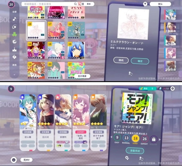 点击单人或者多人演出后进入加载选取界面:左边可以选择喜欢的翻唱或者喜欢的歌曲。右边选择难度,根据自己适应性选择(数字越大难度越高)下面麦克风键切换版本: