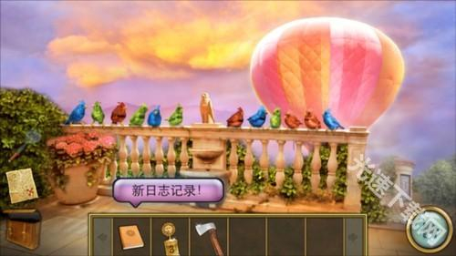 4、进入房间后,取一勺鸟食,随后离开房间到达有花的路口并向左转,拾起太阳雕像,并记下牵牛花的图案。接着上楼,会看到一个无法启动的热气球。继续上楼,取得斧头,给小鸟喂食,并记录下鸟儿的图案。