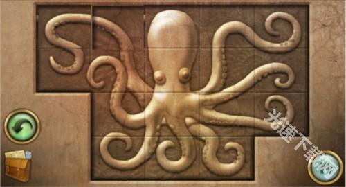 坐小船来到小岛,把海螺壳嵌到石壁上,拼出章鱼图像即可开门。