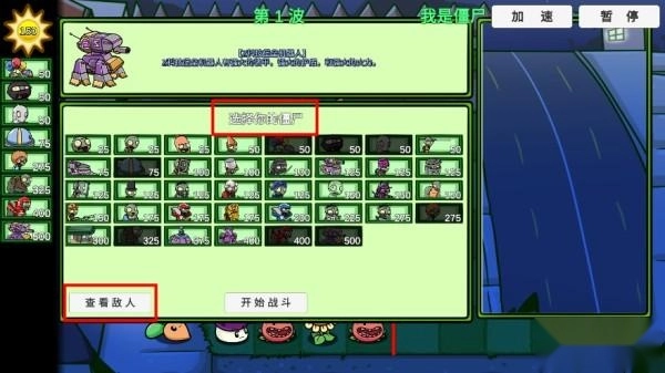 3、和常规玩法一样,玩家能够依据敌人的布阵来挑选僵尸投入战斗;