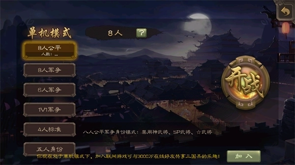 支持联网作战,可开启五人或八人对局,玩家将随机分配为主公、忠臣、反贼、内奸等身份,与百万玩家在线实时对战。