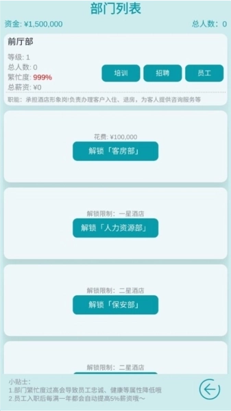 康乐部:为酒店提供健身房、器械健身、球类健身、游泳、桑拿、按摩等各类服务。在游戏里,每个部门都有着独特的作用,并且会触发不一样的事件。
