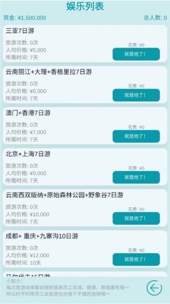 游戏的内部员工设定了能力、忠诚、颜值、健康、年龄、身高体重等属性;不同的数值会引发不同的事件。