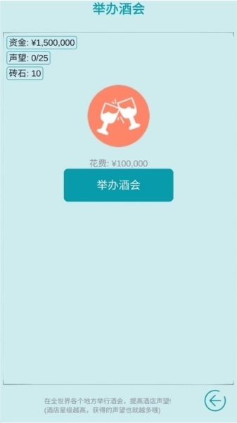 在具备上述要素的前提下,若想进一步提升客流量,营销环节就显得尤为关键。利用游戏内的“酒会”功能,能够有效增加酒店声望——酒店的星级越高,所能获取的声望值也会相应提升。而举办酒会不仅能迅速扩大酒店的影响力,还能借此吸引更多的客流。