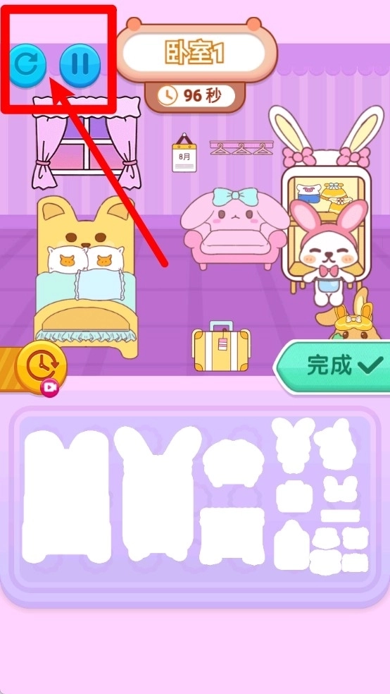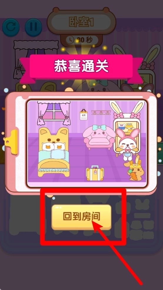 通关提示很明确:完成拼贴任务后会弹出“恭喜通关”的提示,点击“回到房间”按钮就能快速返回,整个操作过程流畅且直观。