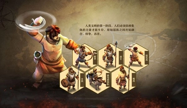 这是人类文明演进的初始阶段,在这段漫长的历史进程里,人类逐步进化为现代人。此时人类开始运用工具,也萌生了交易的意识,原始部落随之开启交流,却也因此卷入吞并的冲突。在文明的第一阶段,人们唯有依靠集体的力量方可存活,原始部族之间也由此展开融合、纷争与吞并。