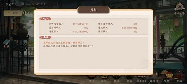 5、先无脑刷到关服,然后看看有没有地能买。最理想的配置是四个勾栏加一个质库,这样就可以无脑刷到下个月了。接着开启漕运,等漕运刷完,差不多就能刷海运了。