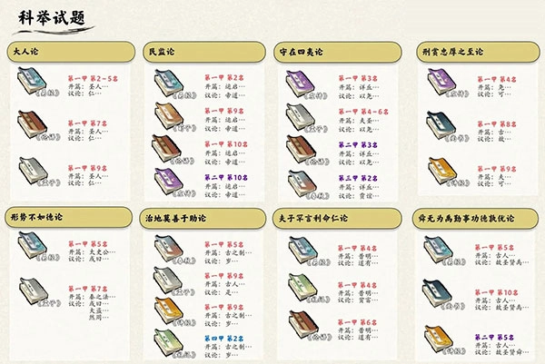 每年三月,京城的皇城都会举办科举考试,考中榜单的人就能入朝为官。考试的题目都要求以四书五经作为引论依据,否则肯定会落榜,因此在还没有获得官职之前,大家的行动点数都用在了去太学获取书籍上。目前测试的结果显示,大致的甲级等级不会改变,但具体名次会有所波动,所以能不能中状元也得看运气。