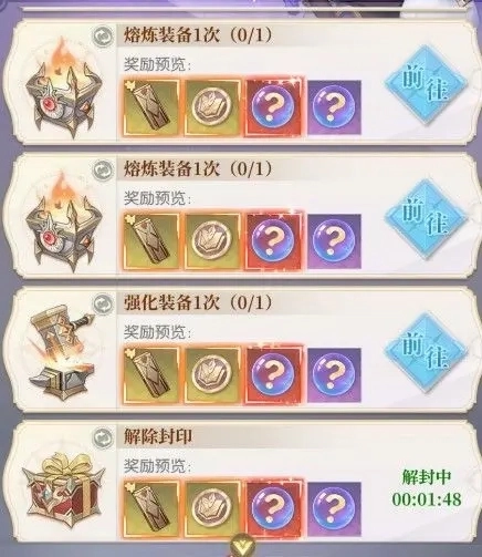 上线之后,冒险者们可以领取当日的冒险任务。以“解除封印”任务为例,玩家能够提前点击来等待任务时间;至于像“强化装备”“熔炼装备”这类其他任务,我们也会在后续的操作流程中顺带完成,这样到最后就能直接领取奖励啦~(PS:冒险任务的奖励会根据游戏内活动的变动而调整,该图仅作参考)