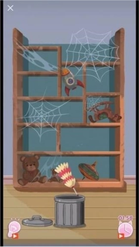 进入游戏后,首先要对整体场景进行观察,弄清楚杂物的分布情况和具体类型。像在给出的书架场景中,能发现蜘蛛网、玩具之类的杂物;而厨房场景里则存在脏盘子、食物残渣等。提前掌握这些信息,有助于合理安排清理的先后顺序。