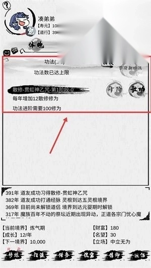 已掌握散修功法贯虹神乙咒的第1阶段,当前进度为0;每年可增加12点修为,功法进阶需要积累100点修为,进阶后能提升后续的修炼速度。