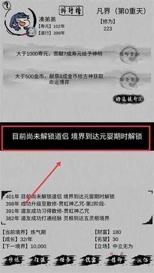 道侣系统尚未解锁,需要将境界提升至元婴期,达到该境界后即可解锁道侣功能,拓展修炼相关的玩法。