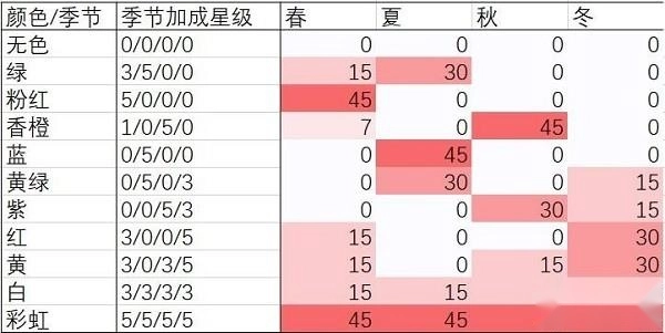 对应季节加成星级的颜色与香味加成数值为0、7、15、30、45,其中7仅出现过一次。