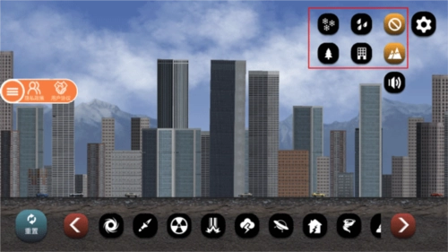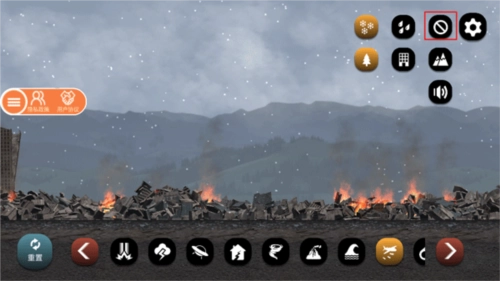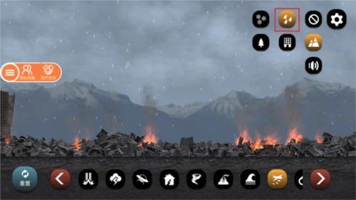 7、当城市被摧毁得不成样子时,你还可以通过降雨或降雪来降降温;要是想关闭天气效果,直接点击右侧带斜杠的图标就行。