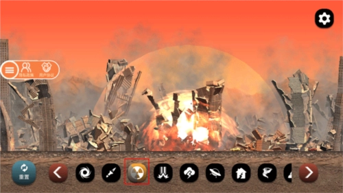 4、中间的多个功能按键对应着不同的城市破坏方式,比如那个类似雷达的图标,先点击这个按钮,再点击目标城市,就会有陨石坠落并摧毁该城市的所有建筑。