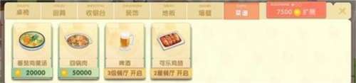 9、右边菜单下第一位:食谱,会给你获得的提示!明显的提示:购买途径,餐厅升级(这里指扩张餐厅布局)。比较隐秘的如:xxx喜欢/会做/有线索的提示,直接将这个提示中的员工升到五级就可以解锁此菜谱。