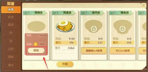 3、解锁菜谱后,一定要点击研究,不然厨师没法制作这道菜,餐厅也就没法靠它盈利啦!另外升级菜谱不仅能提高菜品单价增加收入,还有机会解锁新菜谱,但前期要是资金紧张的话,不建议这么做哦!