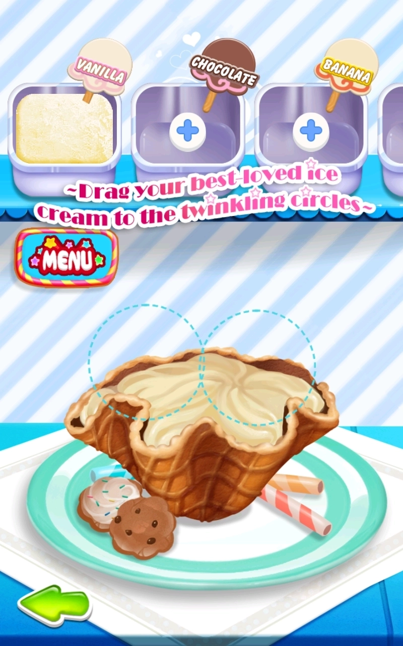 等冰淇淋冻好后,挑选一个玩家心仪的造型,接着把冰淇淋球拖进闪烁的圆圈中,玩家还能搭配不同口味,让它变得更别具一格。