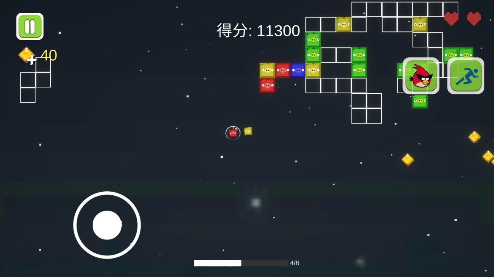 三个颜色相同的方块猪连接在一起时,会产生爆炸效果,从而销毁虚空方块。