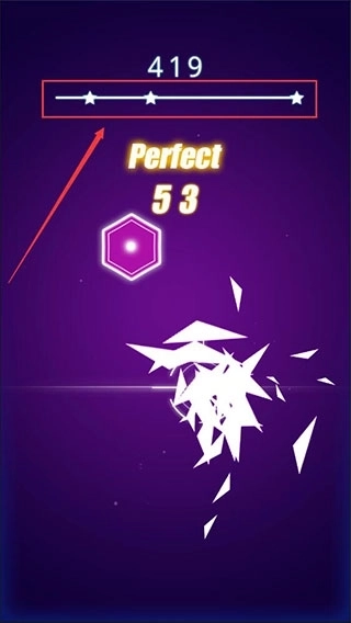 之后上方会接连不断地掉落音符块,当这些音符块落到白线位置时,玩家的准星刚好碰到它,就能得到对应的评分与分数。