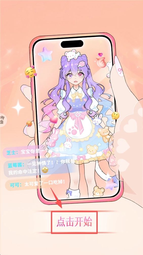 1、点击“点击开始”按钮,进入游戏界面,开启你的装扮之旅。