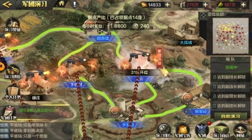 玩家可消耗粮食让上阵将领进行自助演习,通过攻城略地、占领据点来持续获取大量经验与物资;军职等级越高,可挂机的队列数量就越多,能得到的奖励也更为丰厚;此外,演习期间占领的据点越多,军团的升级速度也会相应加快。
