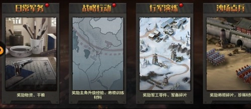 训练项目包括以下内容:日常军务(可产出粮食与银元,特定时段还能获取升级宝典和训练手册);战略行动(通关可获得训练手册及主角经验,关卡会随主角等级提升逐步解锁);行军演练(闯关可赢取军工零件与军备碎片,奖励依据星级评分发放);沙场点兵(满足对应条件通关后,能获得丰厚的粮食与升级经验);组队演练(可获取关键的将领道具,主角等级达45级时开启);兵种特训(可获得兵种研修道具以增强兵种伤害,主角等级满60级后开启)。
