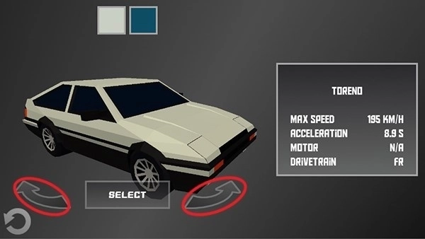 之后玩家便能挑选车辆了,点击下方的箭头能够切换车辆,上方的颜色框可以更换车辆颜色,选好之后点击RELECT就可以开始赛车。