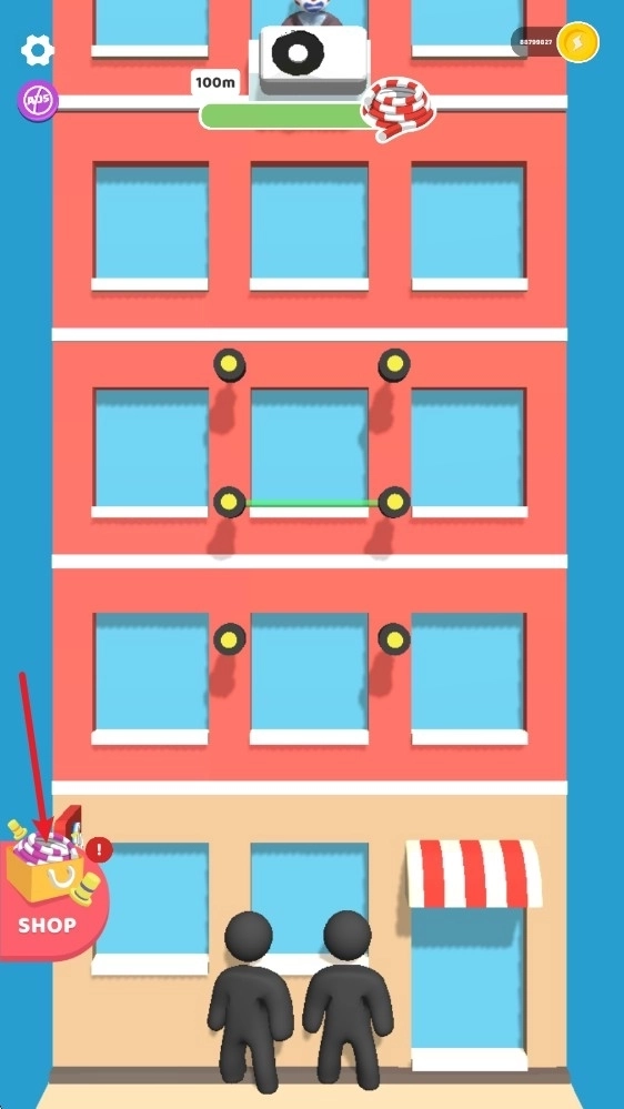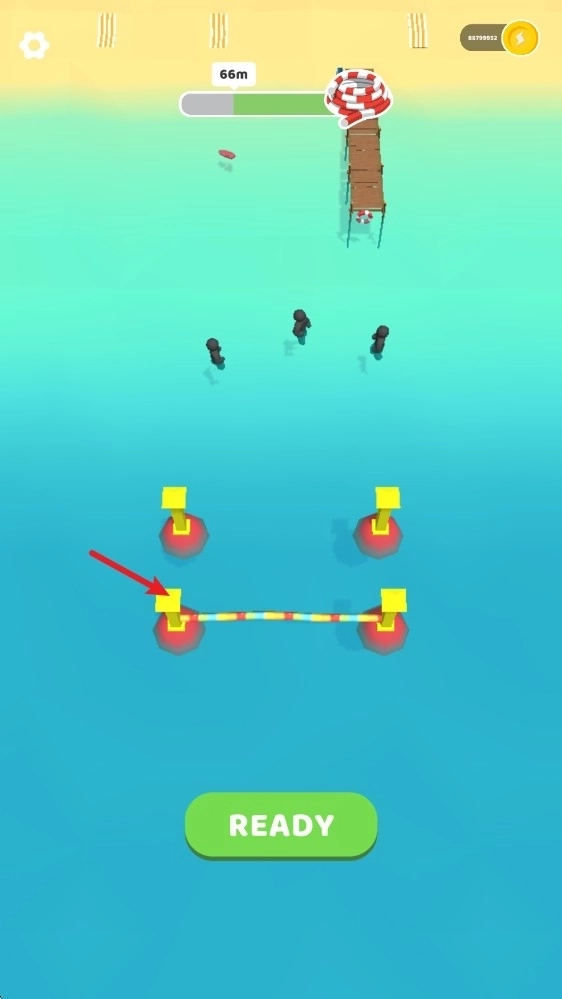 游戏中,我们点击柱子然后拖动即可用绳索连起来。