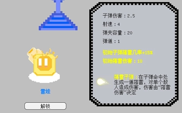 需要消耗675金币解锁,发射的子弹有概率触发落雷效果并造成伤害;该武器子弹伤害偏低,不过弹匣容量相当大。
